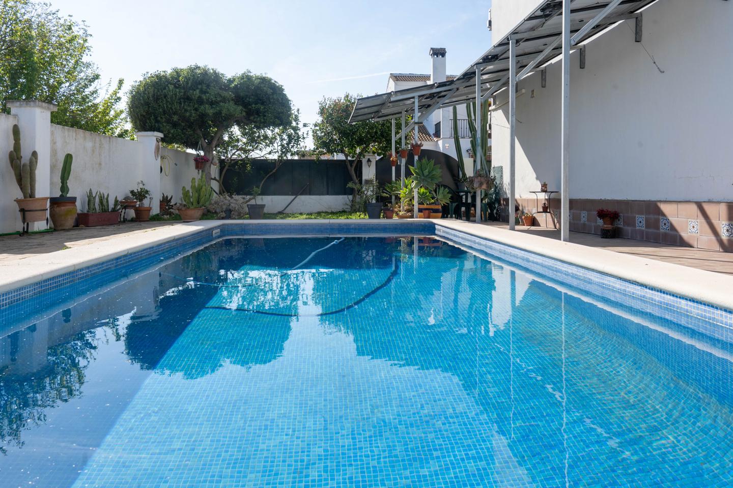 Located in a consolidated residential area of Sanlúcar la Mayor, this house with pool near Seville offers a built area of 284 m², combining interior space, energy efficiency and a layout designed for family living.