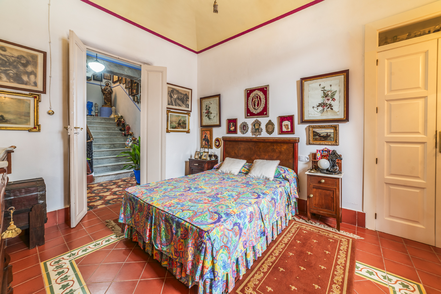 The upper floor is accessed via a magnificent marble staircase, which gives the house a majestic and picturesque air. Three additional bedrooms, spacious and bright, with frescoed ceilings: authentic historical paintings add a unique artistic touch.