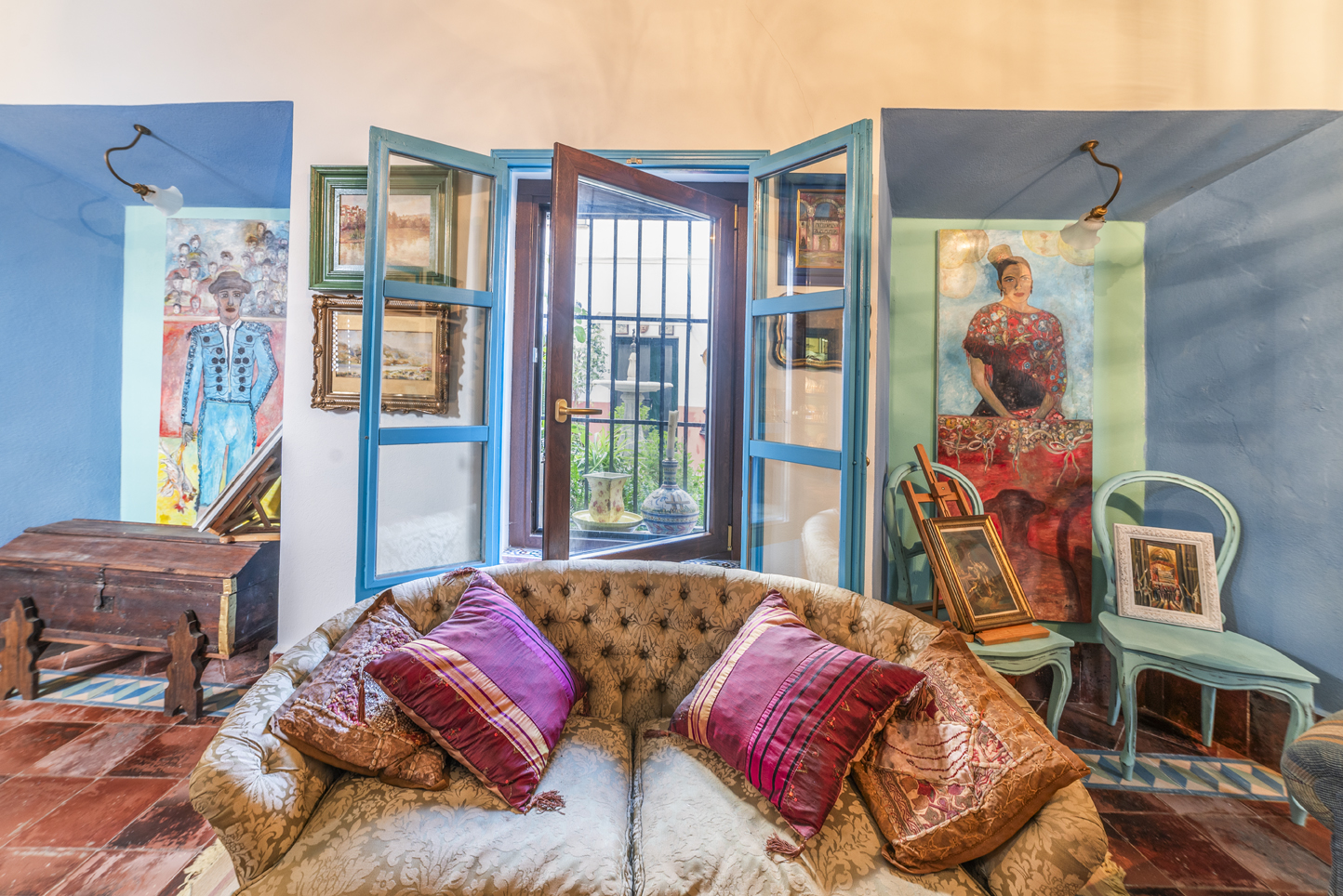 Three spacious bedrooms with high ceilings, most decorated with frescoes, are flooded with light.
