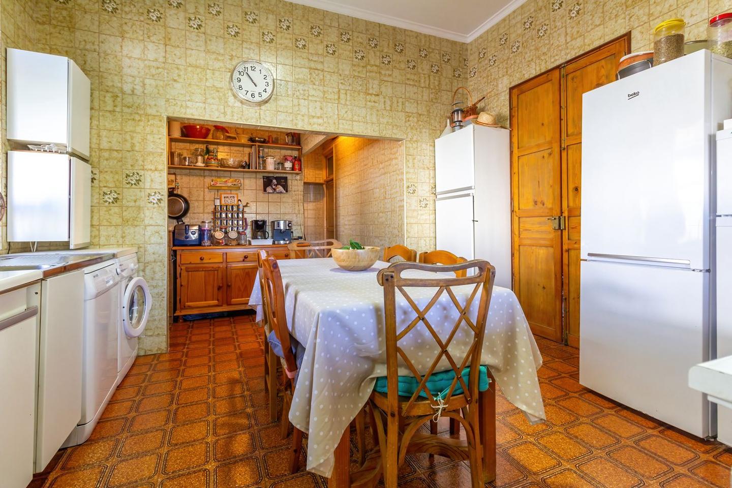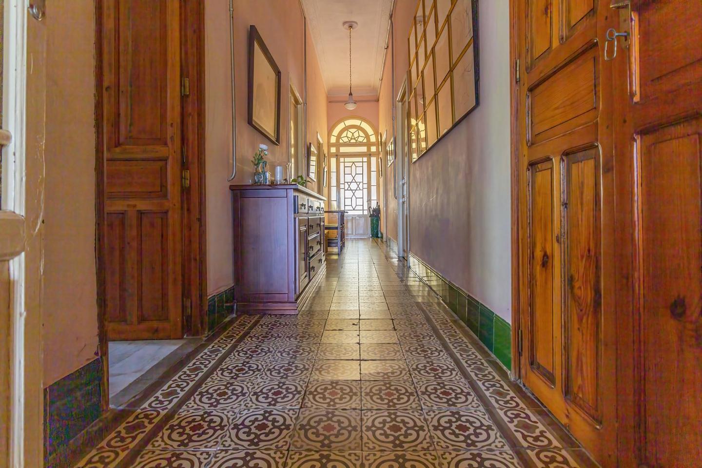 La casa se distribuye en seis dormitorios, tres baños, salón principal y cocina. Dispone de calefacción, garaje privado, dos sótanos y cuartos de almacenamiento exteriores. Sus suelos hidráulicos originales aportan personalidad y conservan detalles de la arquitectura tradicional andaluza.
