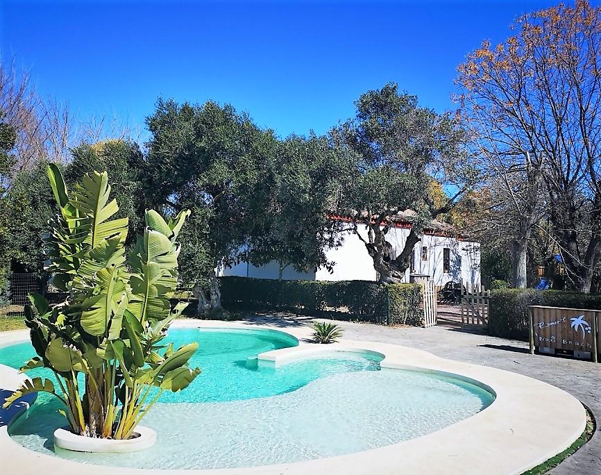 ✅Piscina con diseño escalonado (zona tipo playa, zona de relax con taburetes y sombrilla integrada)