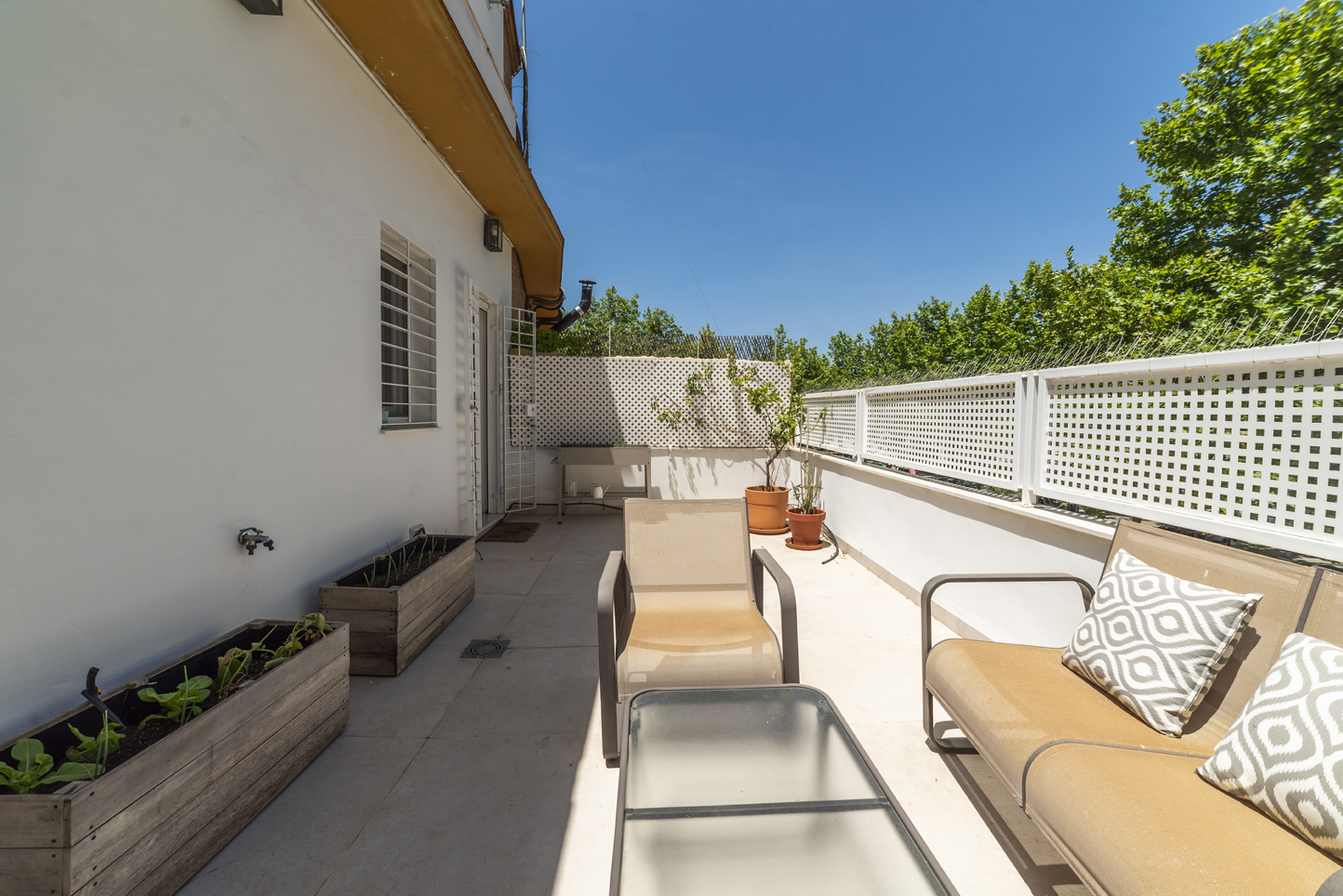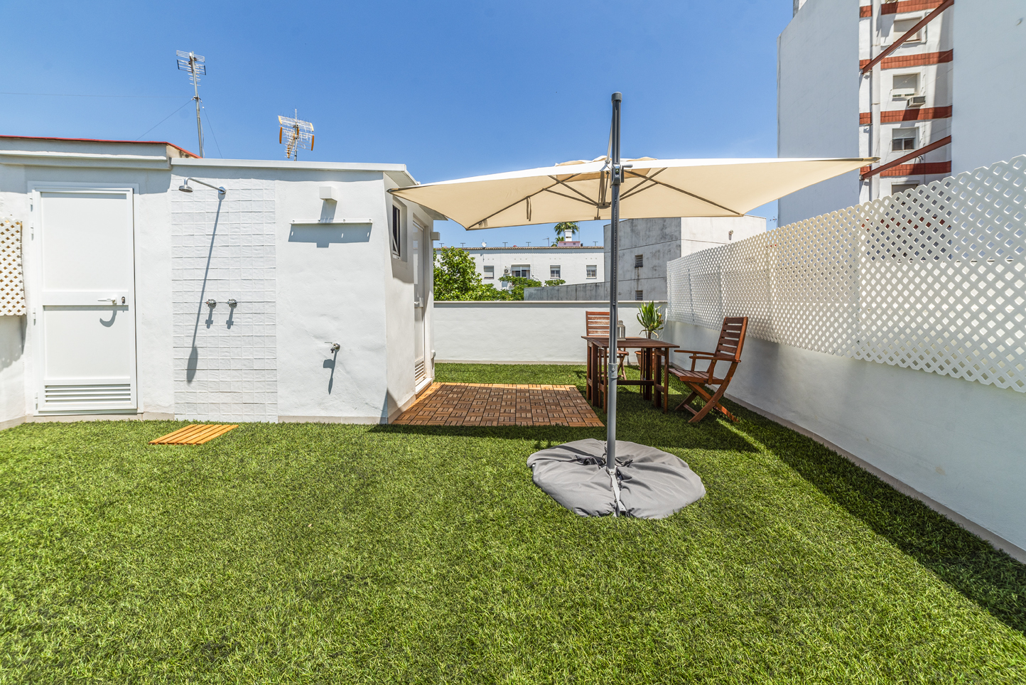 Arriba, la vivienda cambia de ritmo. Dos terrazas privadas y un solárium con ducha en la azotea amplían la casa hacia el exterior. Desde ahí se ven los jardines de la urbanización y el cielo abierto de Sevilla. Es un espacio que se usa: desayunos tranquilos, tardes largas, noches de verano.
