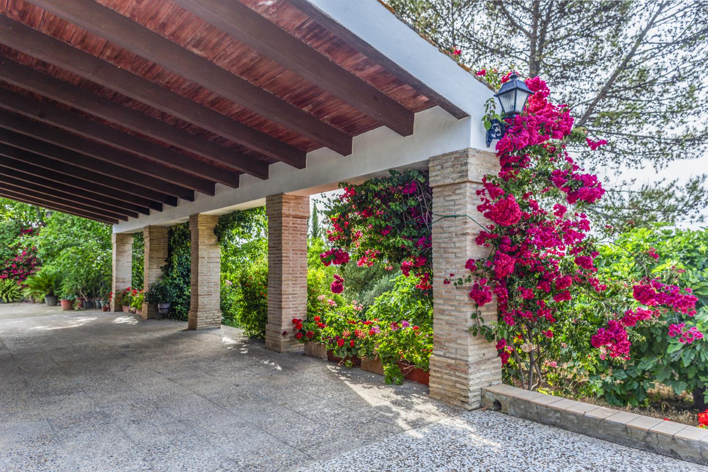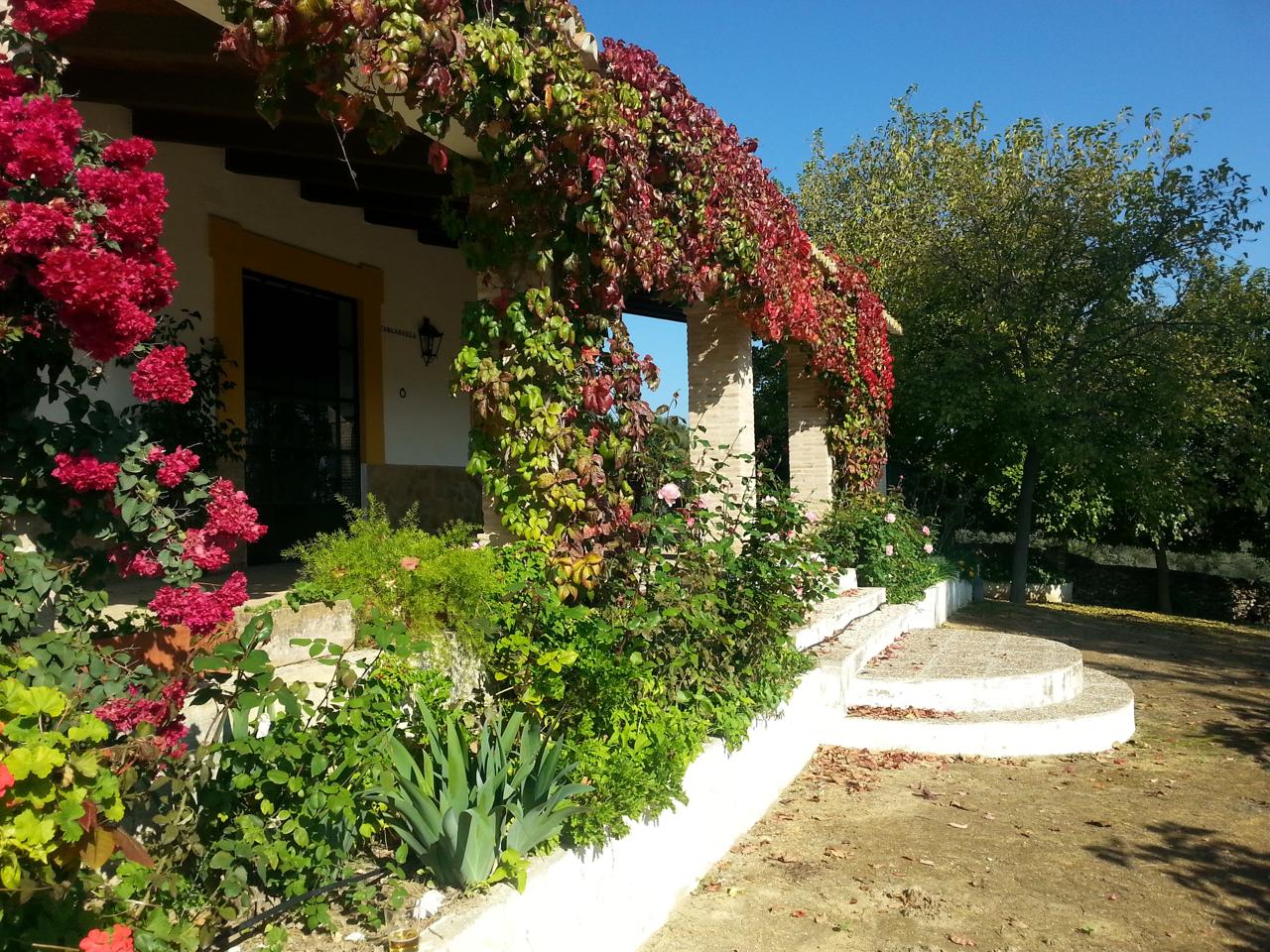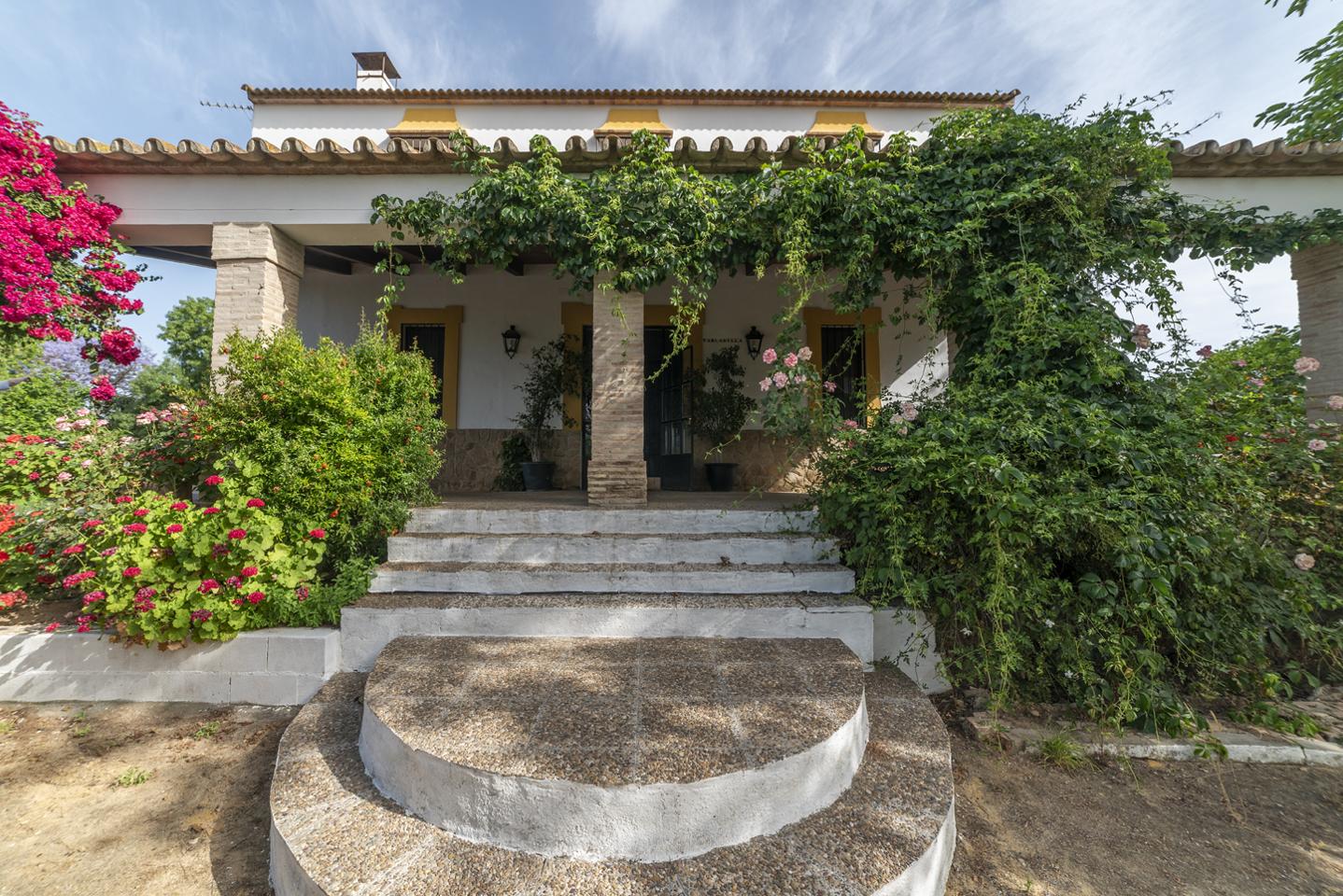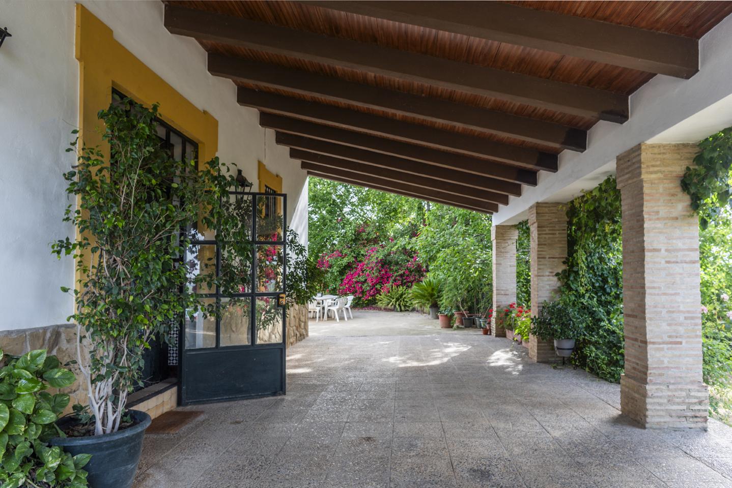 La entrada principal de la casa cuenta con un gran porche cubierto desde donde se pueden contemplar gran parte del valle del Guadalquívir, con pueblos como Carmona Lora del Río, Peñaflor etc.