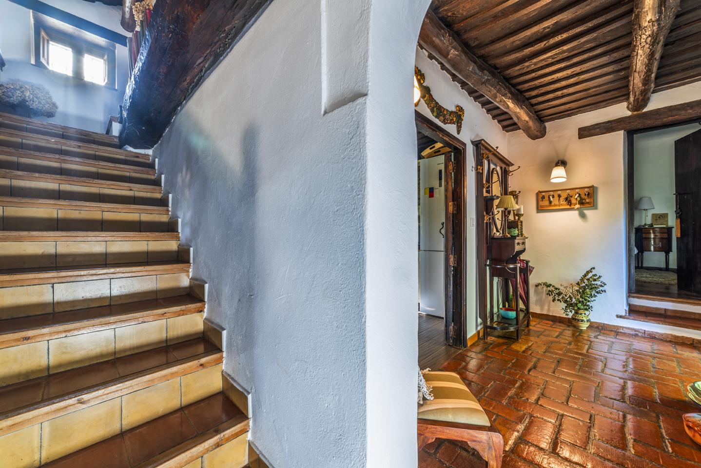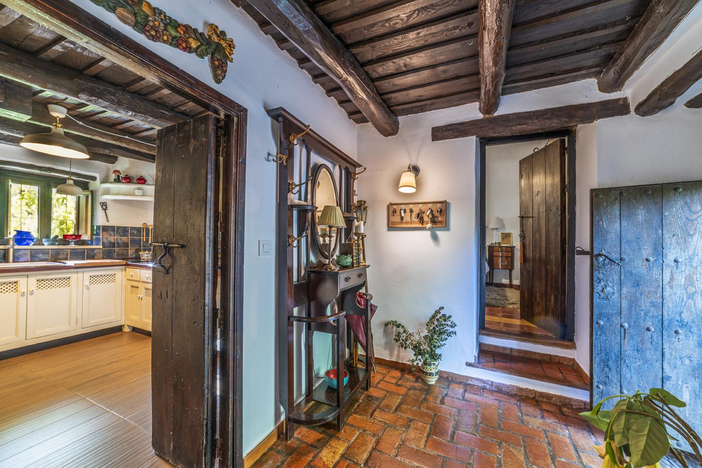 Al entrar, el hall distribuye las estancias de la casa, donde se combinan suelos de madera y barro, techos con vigas vistas y materiales tradicionales que aportan carácter. El salón principal, presidido por una chimenea, invita a reuniones familiares, tardes tranquilas o largas conversaciones al calor del fuego.