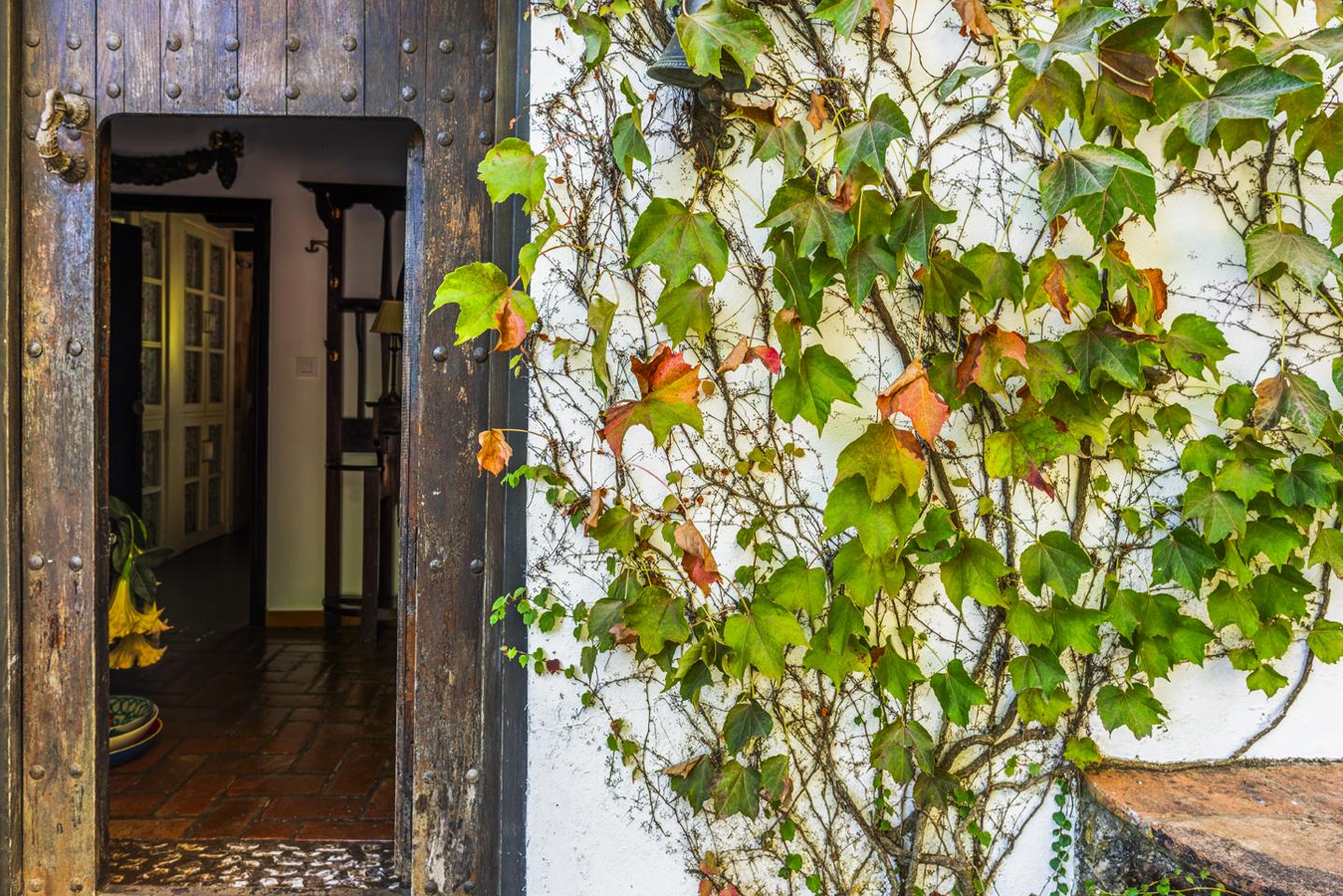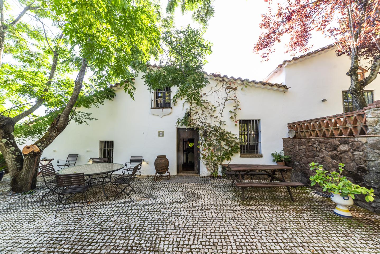 La finca cuenta con una casa principal rodeada de jardines cuidados que crean distintos espacios de descanso y contemplación. Desde el exterior se accede a un amplio porche, que actúa como transición entre el paisaje y el interior de la vivienda.