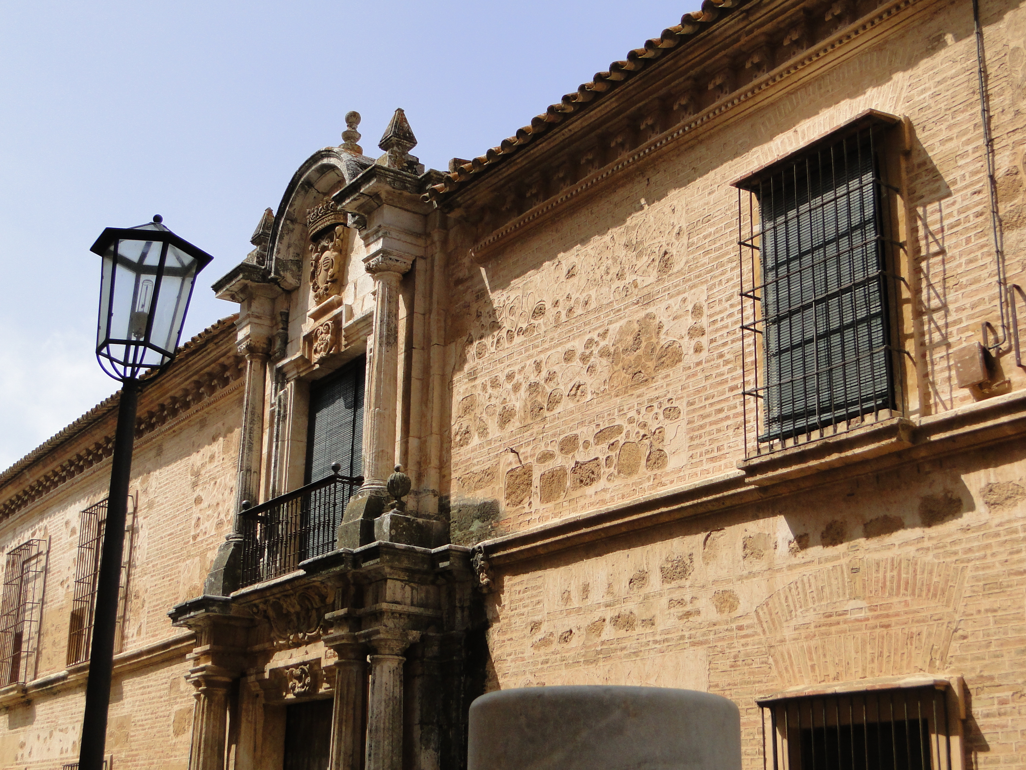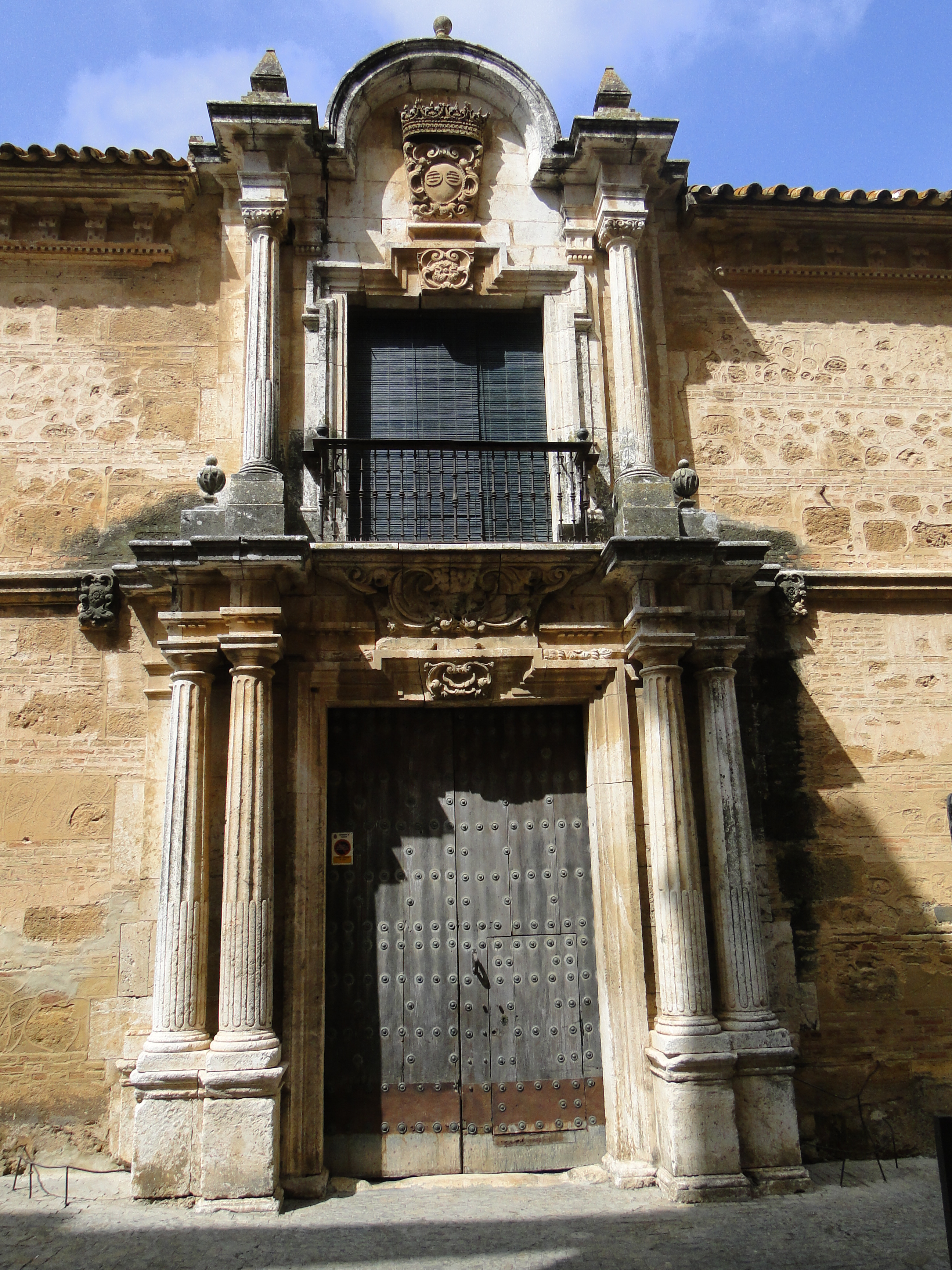 El cuerpo alto queda a su vez centrado por un balcón recercado en todo su perímetro por un recto baquetón con orejetas en los ángulos superiores y decorado en su parte central del dintel. Aparece flanqueado por columnas también de fuste estriado que acaban en capiteles sobre los que se recrecen dados que soportan una cornisa que, sobre las columnas son horizontales y acaban en pináculos piramidales, y sobre el centro del hueco forma un arco a modo de frontón curvo donde se aloja el escudo familiar de los Rueda y que remata la portada.