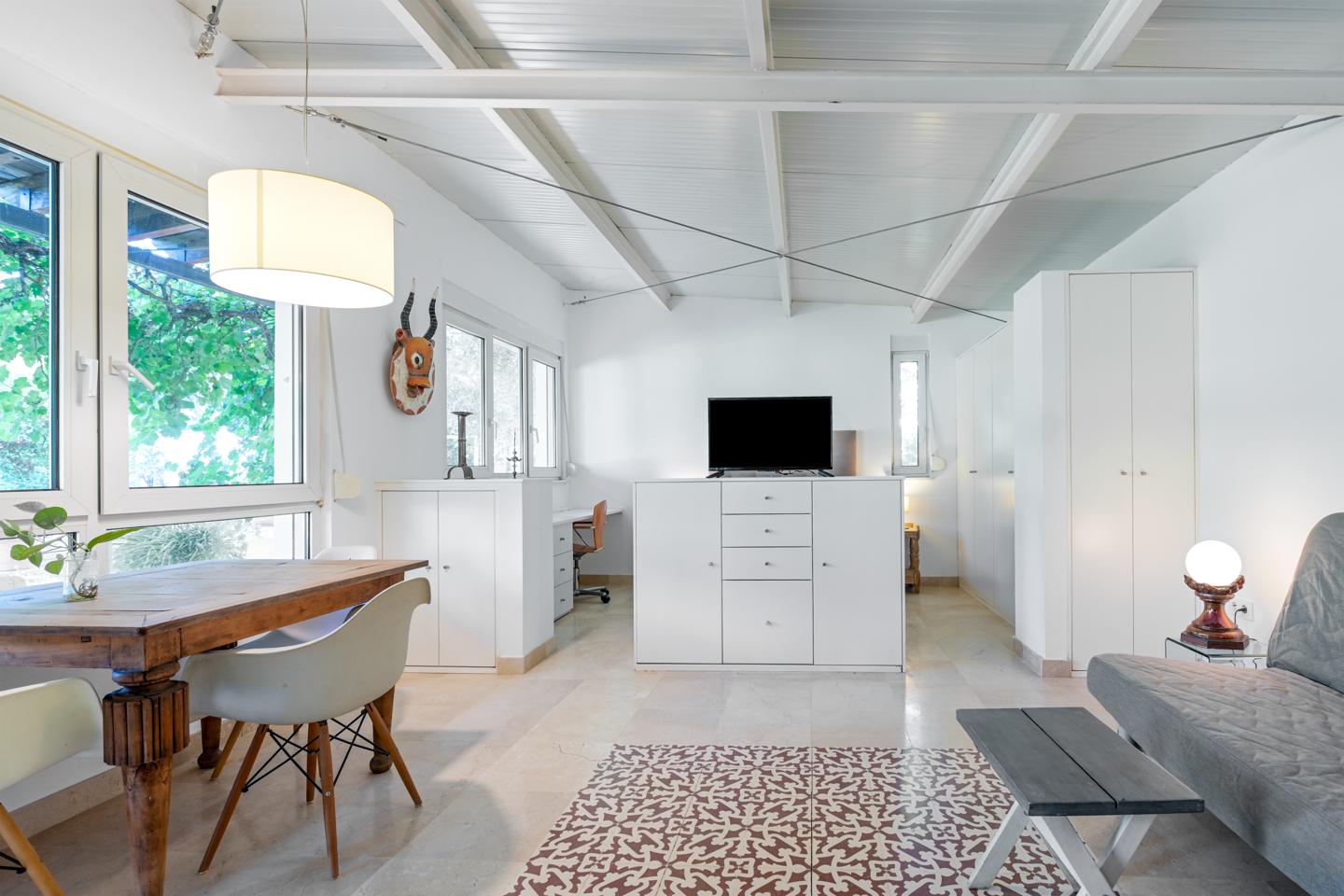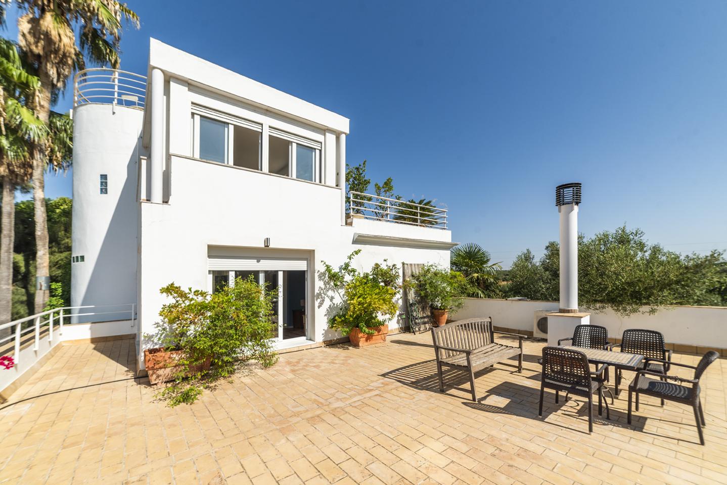 Cada detalle ha sido pensado: energía solar térmica y fotovoltaica, aerotermia para frío y calor, suelo radiante, ventanas de PVC con doble acristalamiento y persianas automatizadas convertibles en menorquinas. El agua llega de un pozo propio durante todo el año, con posibilidad de conexión a la red. Seguridad, confort y eficiencia conviven aquí, junto a un garaje cubierto para dos coches.