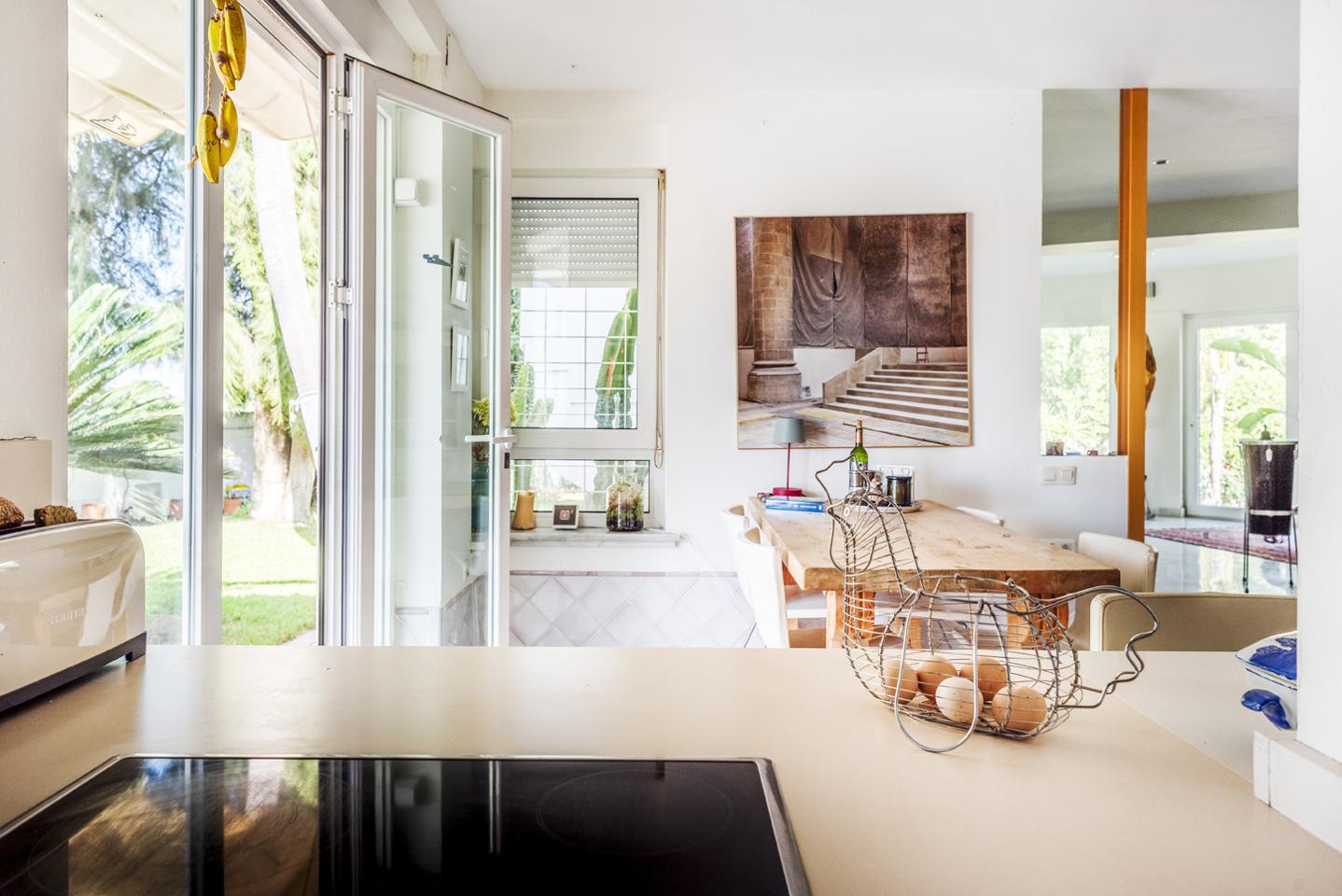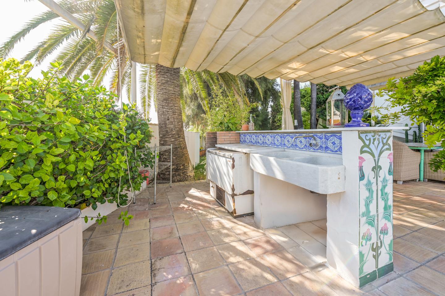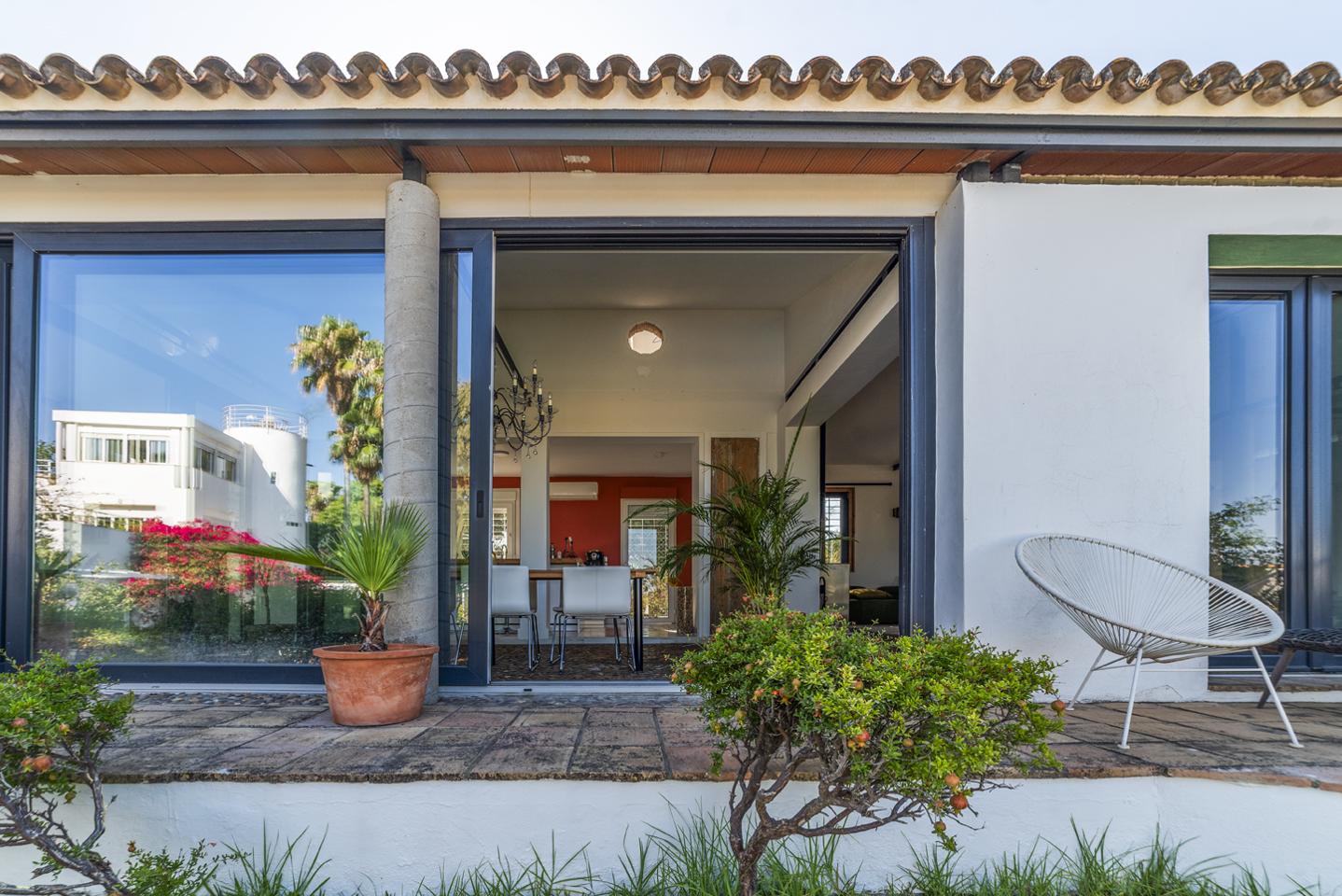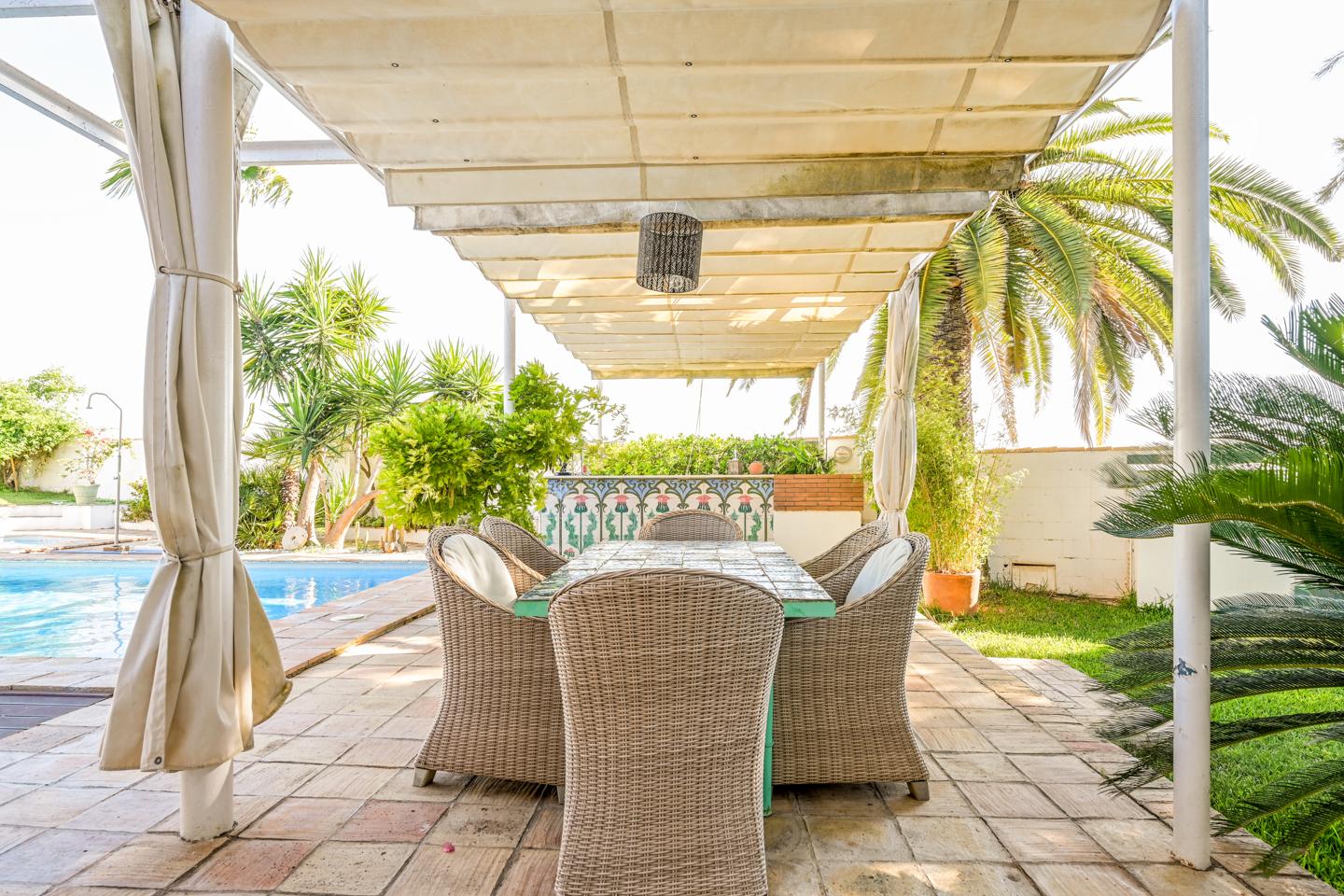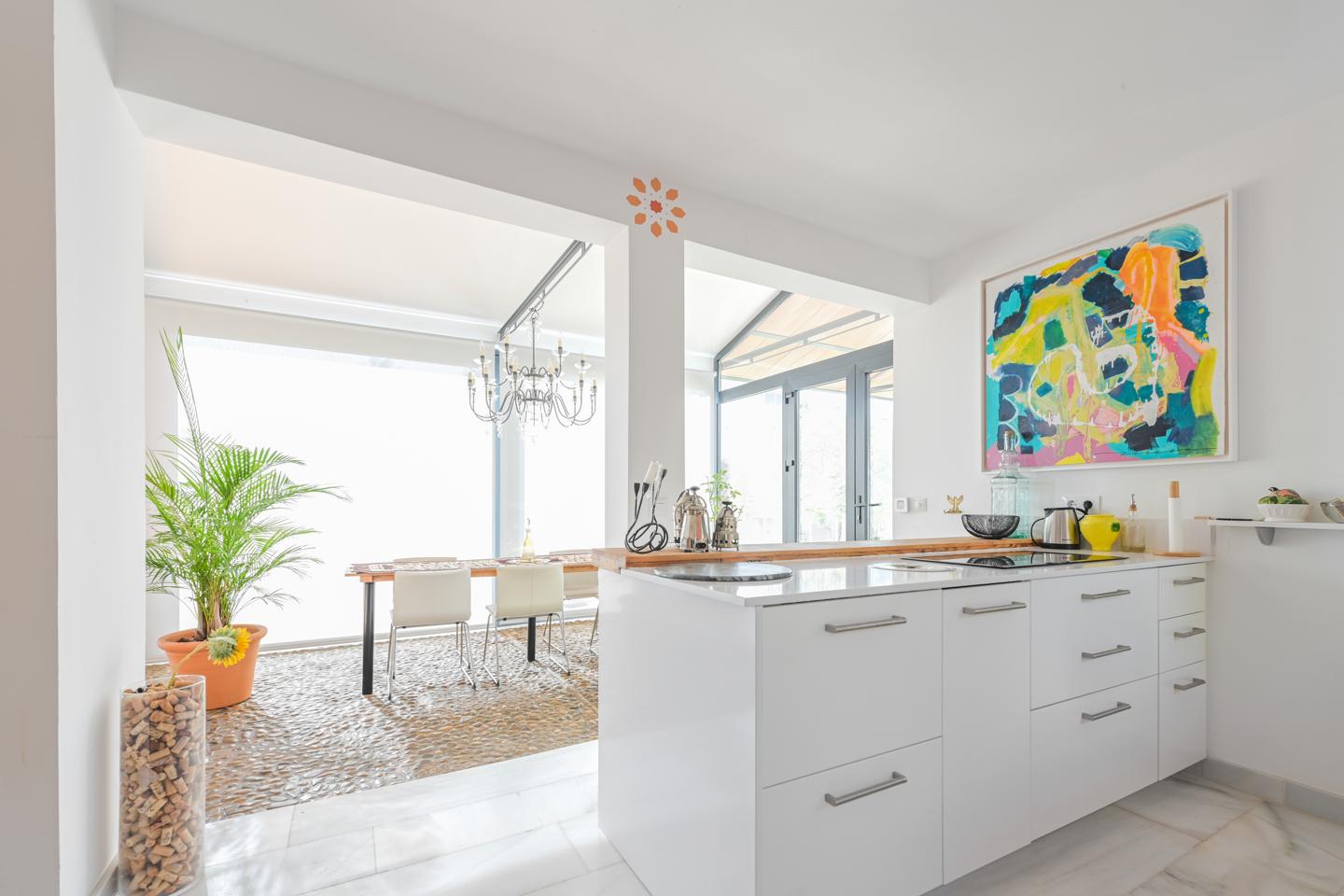 En la planta baja, el hall de entrada ya marca el tono: amplitud y luz. La cocina equipada conecta con el salón-comedor, donde una chimenea y los azulejos antiguos de Mensaque recuerdan la tradición andaluza. El porche junto a la piscina se convierte en un espacio para comer, relajarse o disfrutar del aire libre en familia, con barra y zona chill-out bajo pérgola. Dos dormitorios con armarios empotrados, dos baños completos y un cuarto de lavandería completan esta planta.