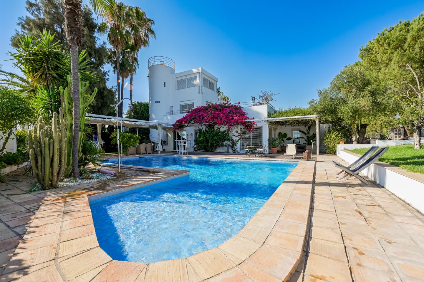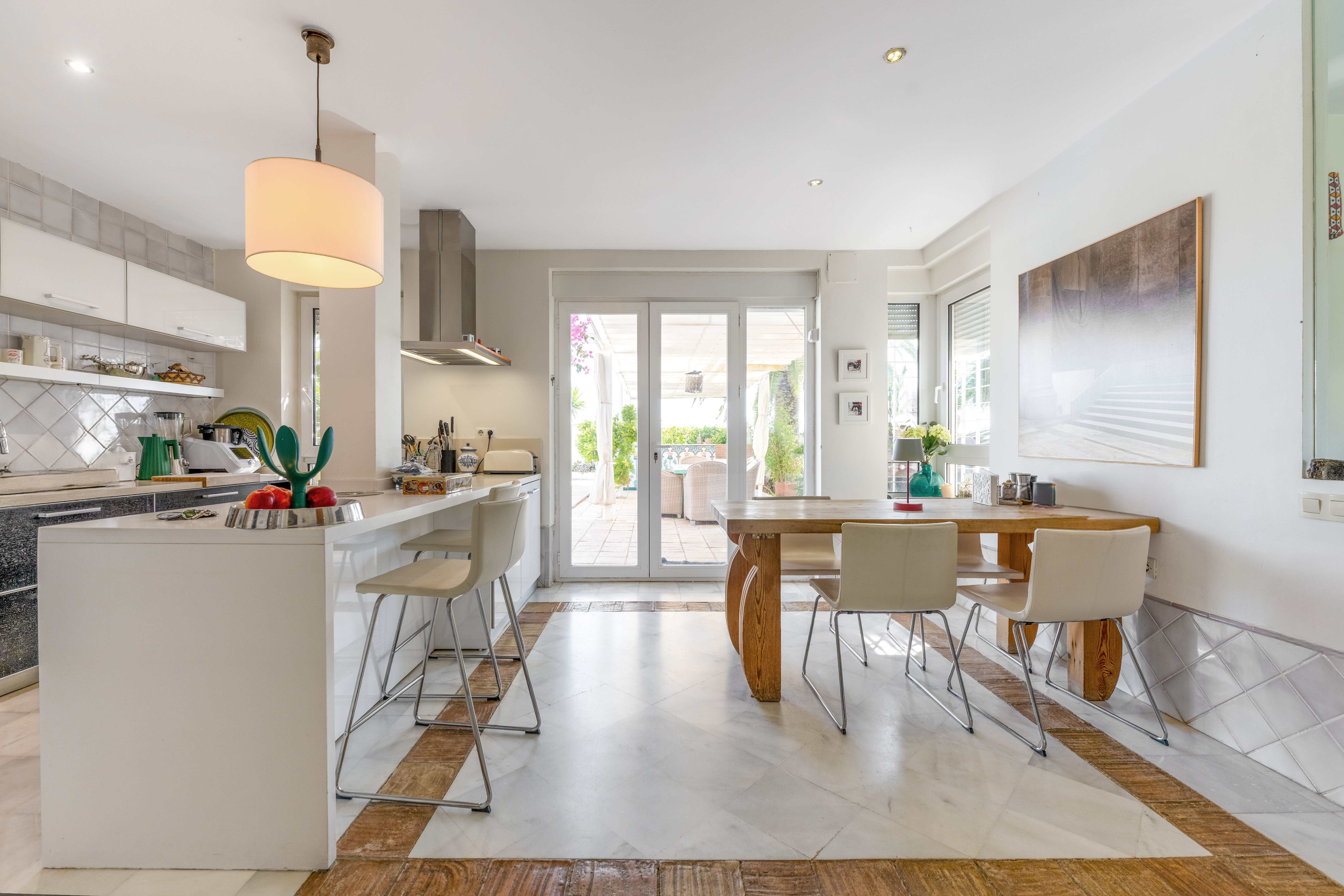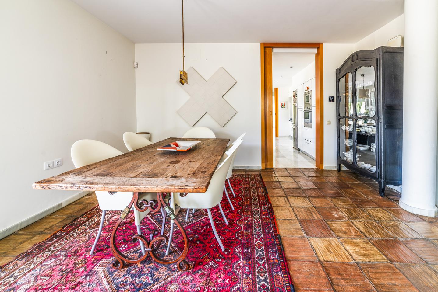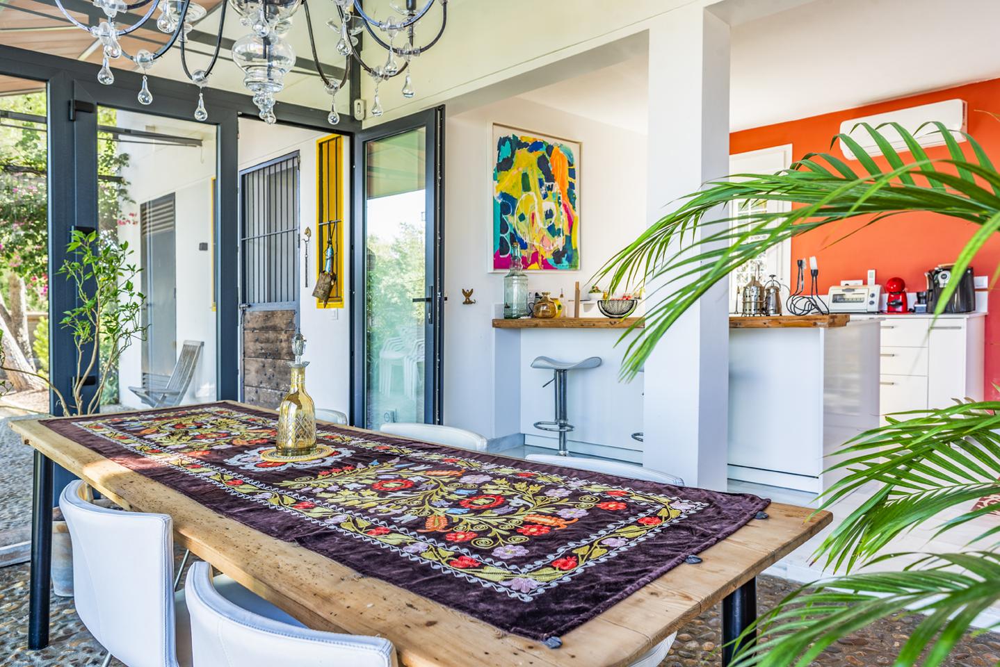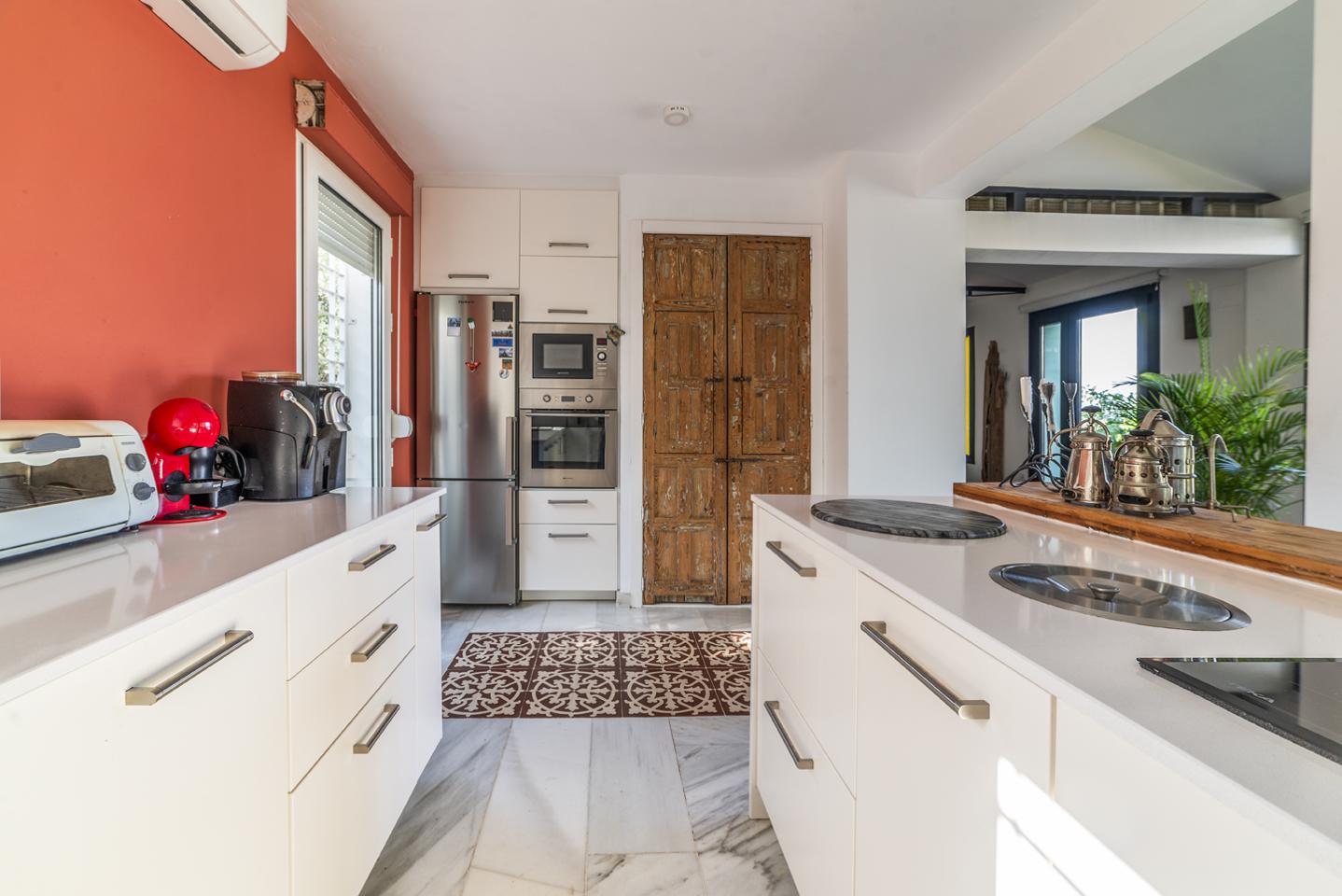 En la planta baja, el hall de entrada ya marca el tono: amplitud y luz. La cocina equipada conecta con el salón-comedor, donde una chimenea y los azulejos antiguos de Mensaque recuerdan la tradición andaluza. El porche junto a la piscina se convierte en un espacio para comer, relajarse o disfrutar del aire libre en familia, con barra y zona chill-out bajo pérgola. Dos dormitorios con armarios empotrados, dos baños completos y un cuarto de lavandería completan esta planta.