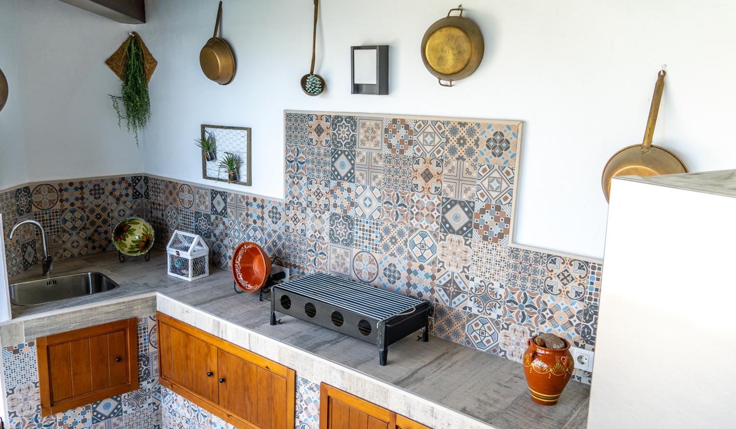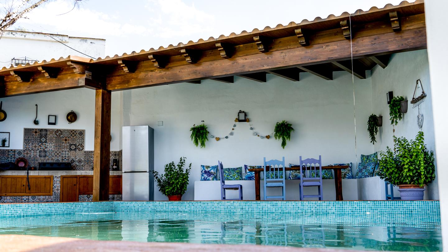 •Cocina exterior bajo pérgola de madera, completamente equipada con electrodomésticos y barbacoa, ideal para comidas al aire libre.